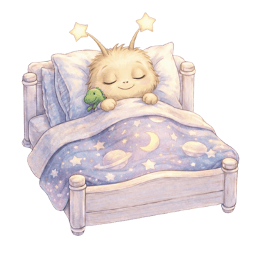 Friendly creature on a flying bed: child is escorted through the city by a friendly, smiley creature with shining stars. The creature is travelling on a magic flying bed that has the ability to turn into a city-relevant mode of transport. Because what's a city without a little bit of magic?